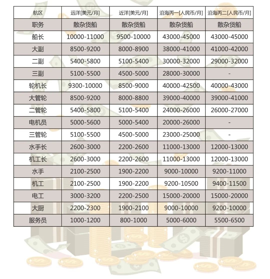(一)薪資待遇海員工資一般包括三部分:基本工資、航行津貼和勞務(wù)費(fèi),這三項(xiàng)收入是穩(wěn)定的,是一種純收入。目前,參考工資如下: